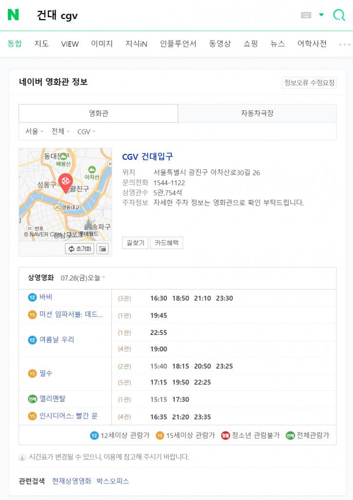 네이버에 검색하면 위 사진과 같은 결과를 얻을 수 있습니다. 하지만 몇좌석이 남아있는지, 러닝타임은 어느정도인지 알수가 없기 때문에 홈페이지를 방문해야만 합니다. 예매를 하기 위해서도 말이죠.
