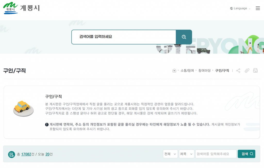 하지만 하루에도 20건씩 올라오는 것을 보면, 계룡시청 구인구직 게시판에는 많은 취업 정보가 올라와 있고, 이용하는 사람들이 많다는 장점이 있습니다. 생활정보지의 역할이 줄어들면서 이러한 지자체의 중요성이 높아지고 있으며, 좀 더 기능적으로 발전된 사이트들이 만들어지면 사용자들에게 큰 도움이 될 것입니다.