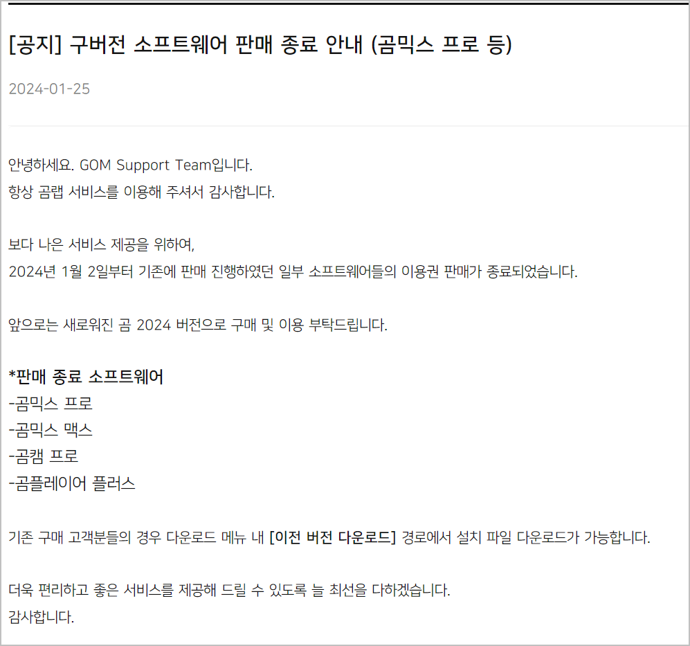 그리고 곰믹스 구버전을 판매하던 곰앤컴퍼니가 2024년 1월 2일부터 구버전 소프트웨어 판매를 종료했습니다. 이는 gommix pro, gommix max, 곰캠 pro, 곰플레이어 플러스 등의 소프트웨어에 해당됩니다. 앞으로는 새로워진 곰 2024 버전을 통해 구매 및 이용할 수 있으며, 기존 구매 고객은 이전 버전 다운로드 경로를 통해 설치 파일을 받을 수 있습니다. 자세한 내용은 곰랩 공지사항에서 확인할 수 있습니다.