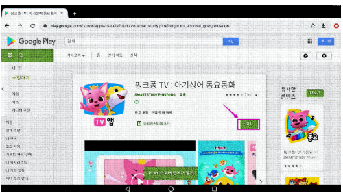 구글 플레이스토어를 스마트폰에 있는 브라우저로 들어갑니다. 주소는 " https://play.google.com/store" 입니다. 여기로 들어가시면 되죠. 그리고 아무 어플이나 하나 찾아봅니다. 저는 핑크퐁으로 했어요.