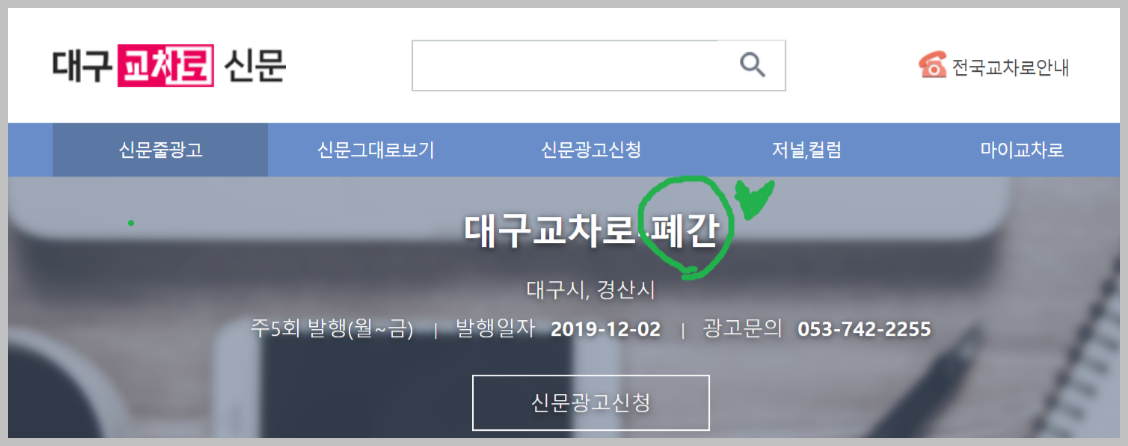 다만 종이로된 신문과 운영주체가 사라졌습니다. 대구교차로신문 홈페이지에 들어가면 신고번호가 창원으로 되어 있는것을 보면 다른곳에서 운영을 하고 있음을 확인할 수 있습니다.