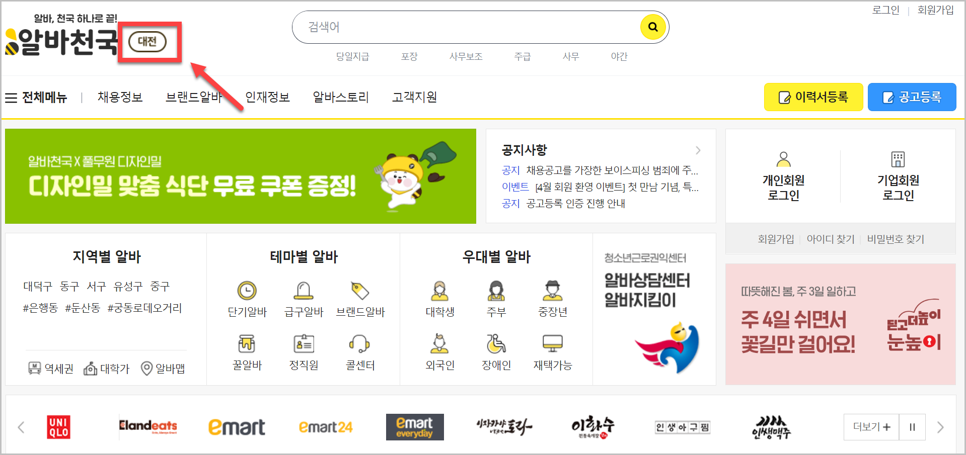 이 서비스는 지역별 사이트를 운영하고 있습니다. 주소도 별도로 존재합니다. 대전 알바천국의 경우에는 주소가 042.alba.co.kr 이라는 주소로 되어 있습니다. 서울의 경우에는 02.alba.co.kr 이라는 주소로 되어 있습니다.