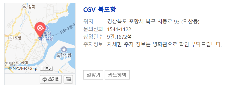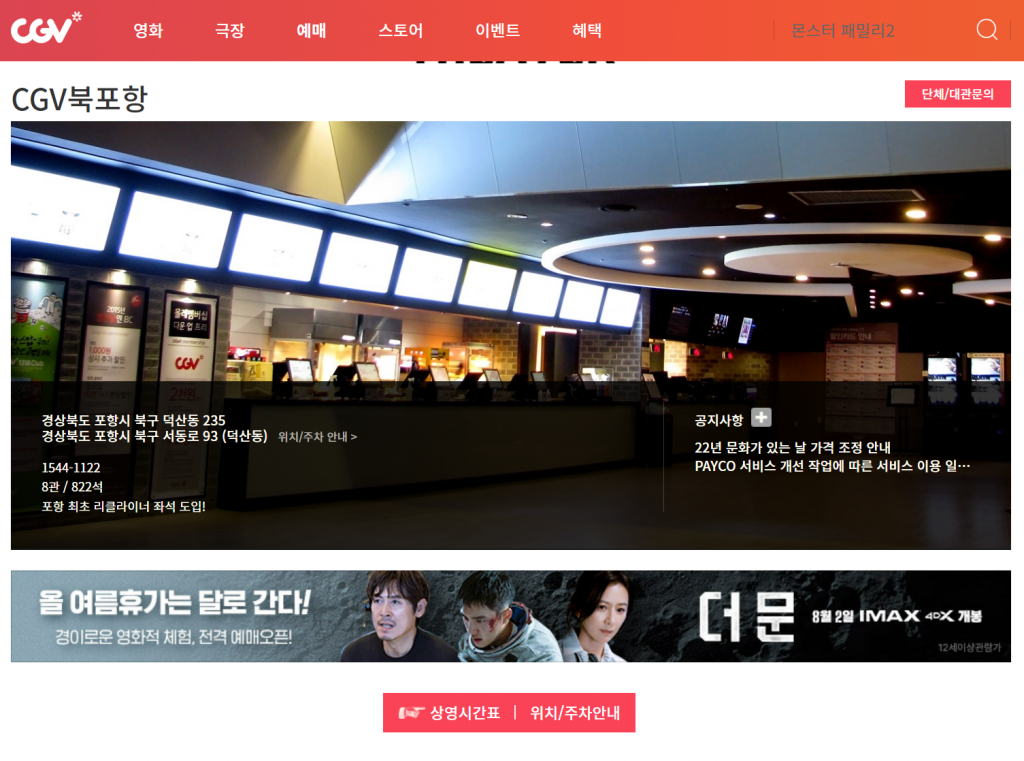 포항에는 CGV가 두 곳이 있습니다. 하나는 포항점이고, 다른 하나는 북포항점 입니다. 하지만 최근 포항점이 문을 닫으면서 현재는 북포항점만 남아있는 상태입니다. 아무래도 코로나 시기를 버티기 어려웠던 것 같습니다. 아쉽네요.