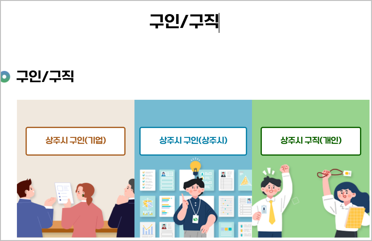 어떤 지자체 홈페이지에는 구인구직과 관련된 항목을 별도로 운영하기도 합니다. 상주시에서도 이와 관련된 것을 제공하고 있습니다.