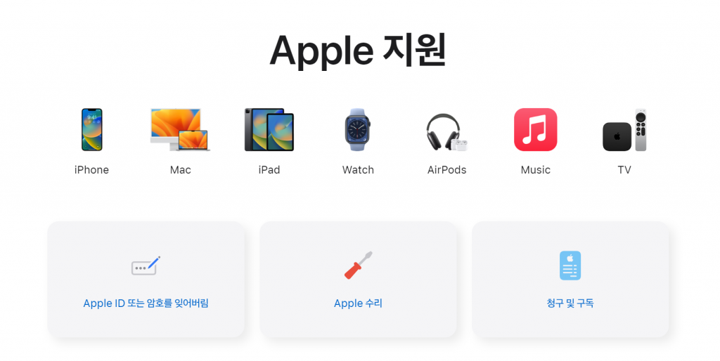 위 링크를 클릭하여 애플 온라인 기술 지원 페이지에 접속하면 위와 같은 화면을 만나볼 수 있습니다. 문제가 있는 기기를 클릭하고, 해당 기기에 대한 케어서비스를 받을 수 있습니다. 예를 들면 암호를 잃어버렸다거나 하는 간단한 문제는 이곳에서 해결 가능한 것 입니다. 이렇게 온라인으로 서비스를 받을 수 있기 때문에 해외 제조사의 기기를 구매한 사용자들도 불편 없이 케어를 받을 수 있습니다.
