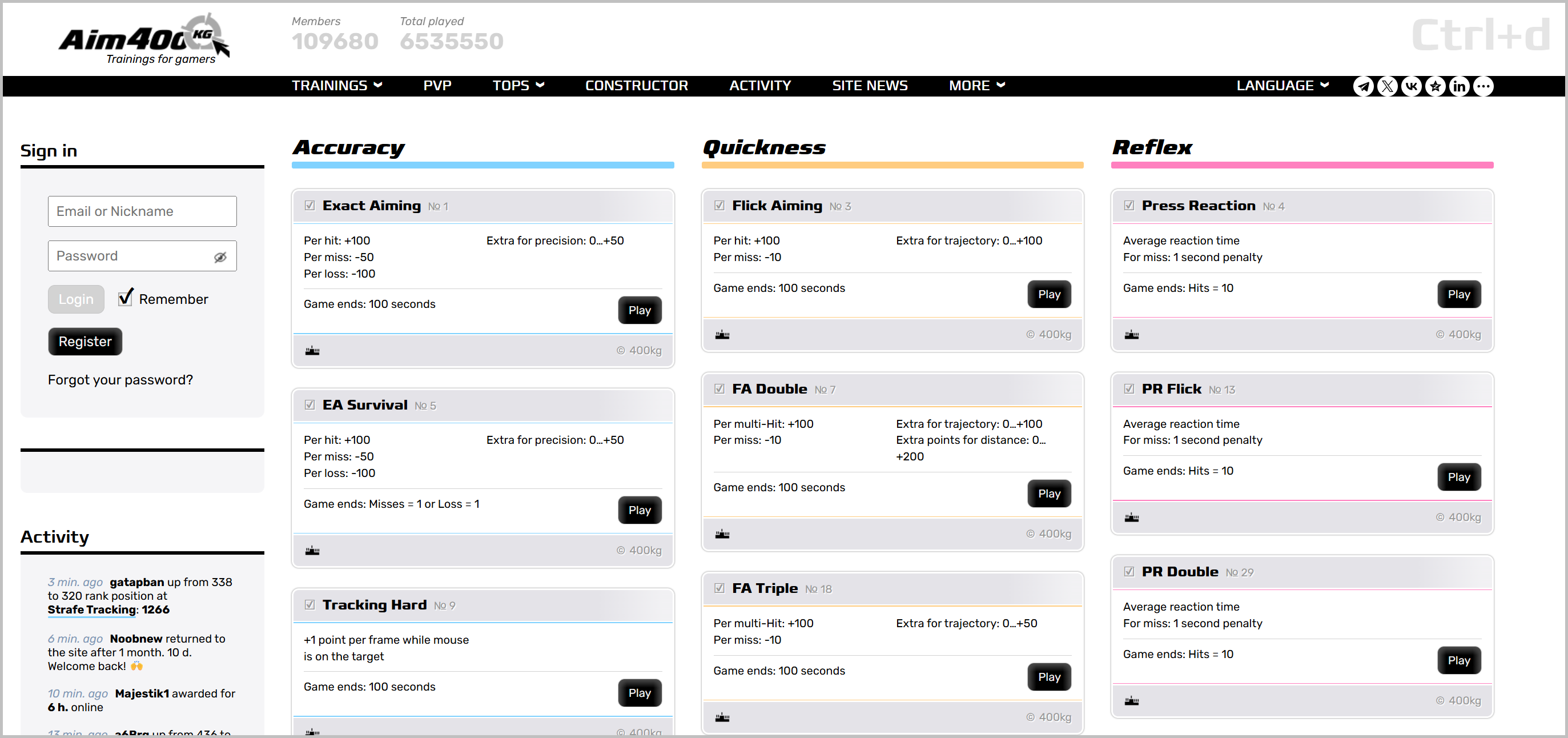 브라우저 기반으로 설치 없이 사용 가능하며, 트래킹·플릭·타겟 스위칭 등 다양한 훈련 모드 제공. 게임 감도와 FOV를 동기화해 실제 환경과 유사하게 훈련할 수 있고, 통계 분석과 랭킹 시스템도 지원.