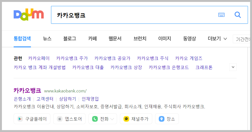 위 화면은 다음에서 검색을 했을때의 모습입니다. 여기에서 첫번째 검색결과를 클릭을 하시면 카카오뱅크 PC 홈페이지로 들어가실 수 있습니다.