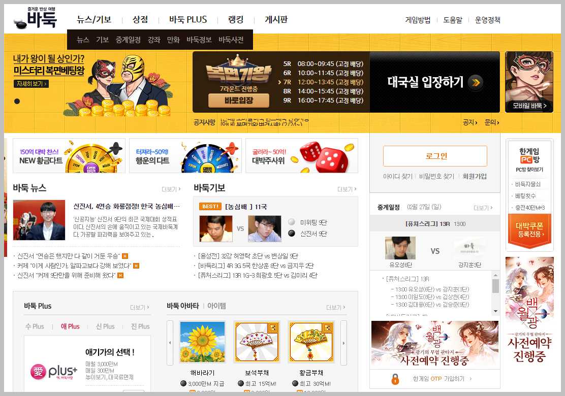 한게임 바둑 홈페이지에 들어가면 아래와 같은 화면을 볼 수 있습니다.