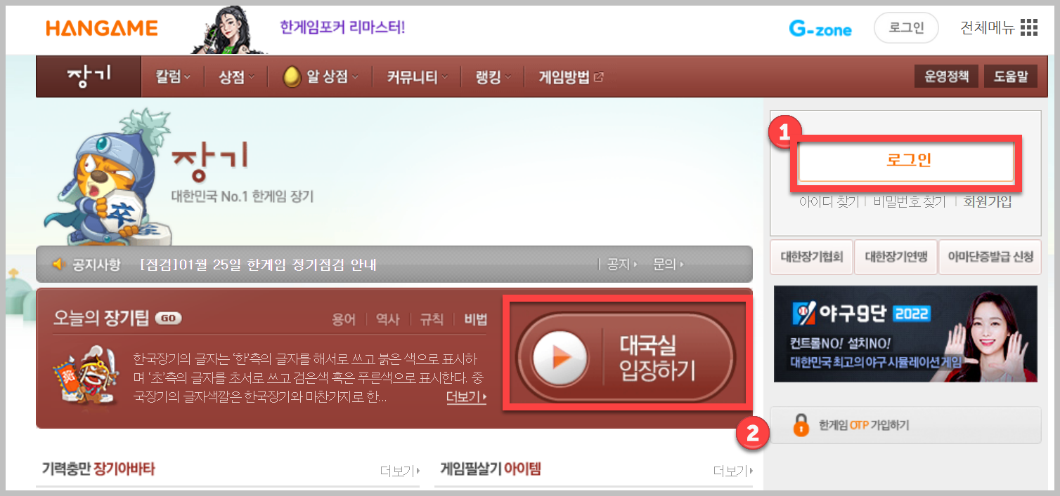 한게임 장기 홈페이지에 들어가시면 아래와 같은 화면은 보실 수 있습니다.