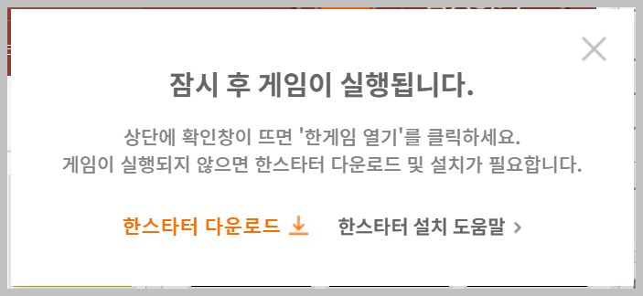 다시한번 '대국실 입장하기'를 클릭을 하면 위와 같은 팝업창이 뜨게 됩니다. 여기에서 '한게임 열기'를 클릭을 하시면 설치가 진행됩니다.