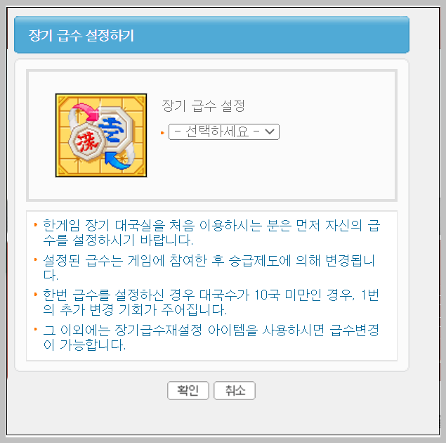 처음에 게임을 실행하면 장기 급수를 설정해야합니다. 설정된 급수는 게임에 참여한 뒤에 승급제도에 의하여 자동으로 변경이 됩니다. 한번 급수를 설정한 다음에 대국수가 10국 미만인 경우에 1번의 추가변경 기회가 주어집니다. 그 이후에는 아이템을 이용해서 수정해야합니다.