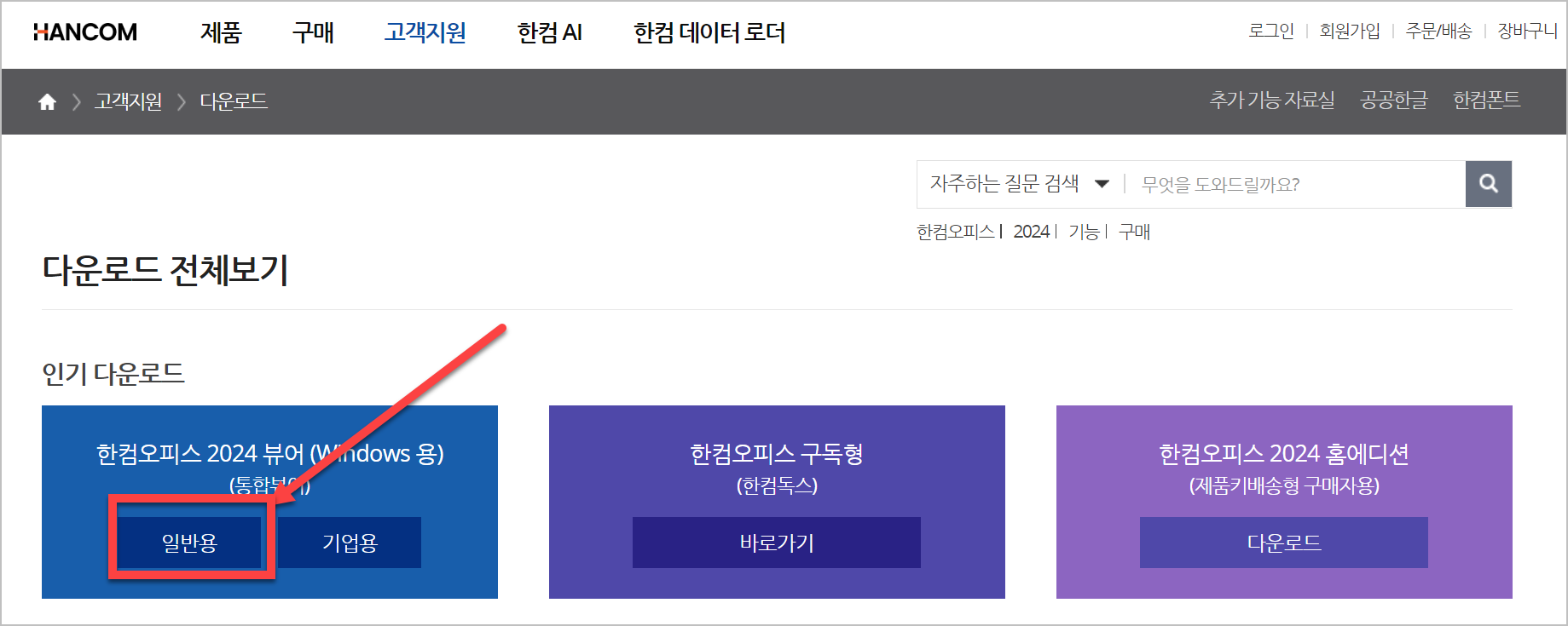 - 한컴오피스 뷰어 사이트에 접속하여 '다운로드' 버튼을 클릭해 설치 파일을 다운로드합니다. :