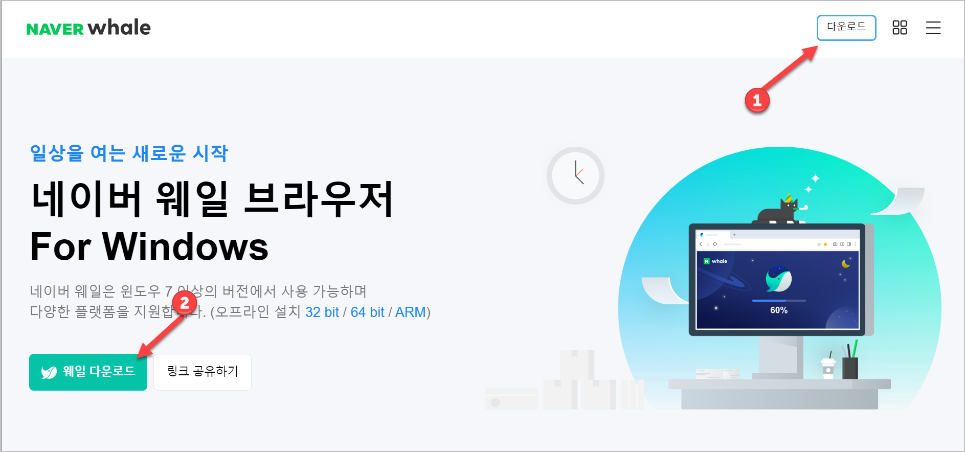 - 네이버 검색창에 '네이버 웨일 다운로드'를 검색하고, 다운로드 페이지에 접속하여 네이버 웨일을 다운로드합니다. : 바로가기