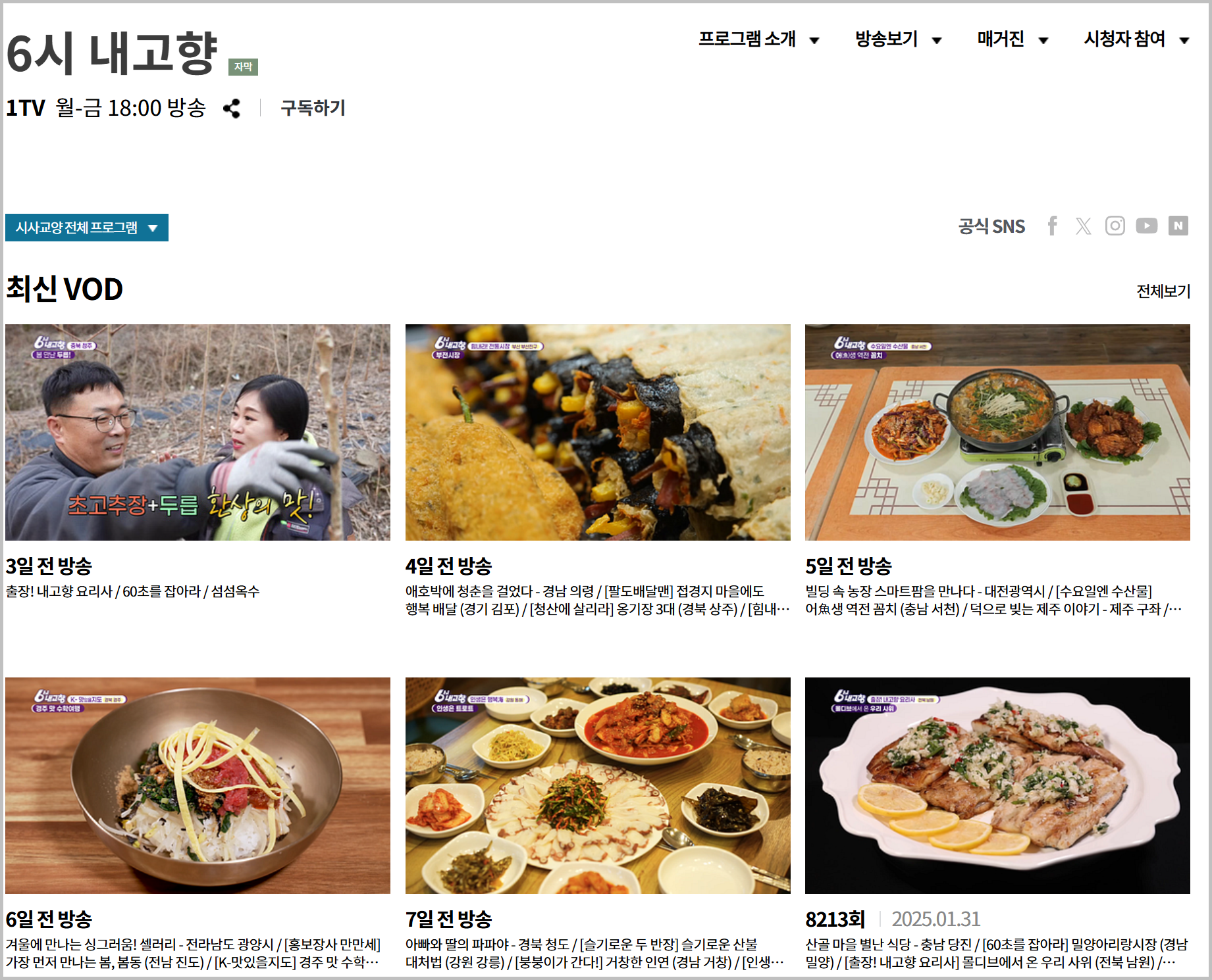 KBS 《6시 내고향》은 공식 누리집(홈페이지)을 통해 다양한 콘텐츠를 제공하고 있으며, 여러 가지 방법으로 참여할 수도 있습니다. 공식 홈페이지를 방문하면 다음과 같은 기능을 활용할 수 있습니다.