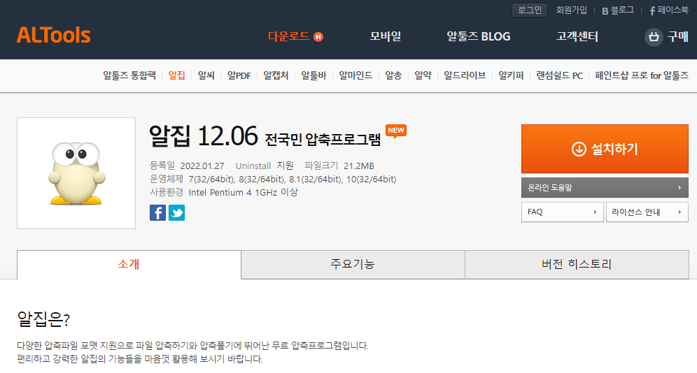 우리나라에서 가장 유명한 압축프로그램은 바로 알집입니다. 알집은 이스트소프트에서 개발한 브로그램으로서 귀여운 아이콘이 특징이지요. 여러 논란이 있기는 하지만 가장 대중적이고, 많은 사람들을 만족시키는 알집 압축풀기 프로그램입니다.