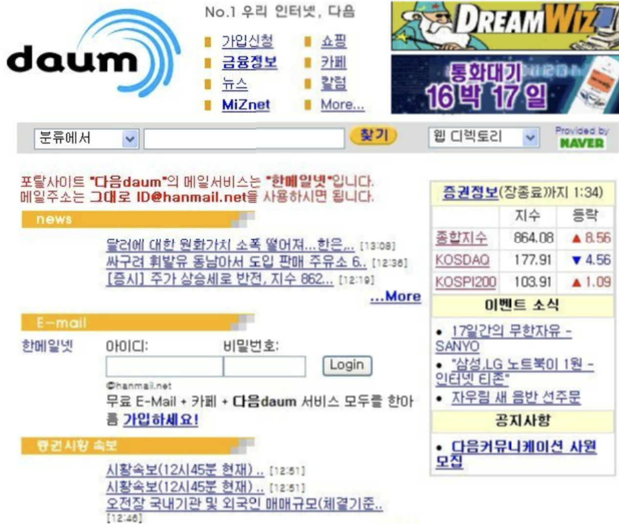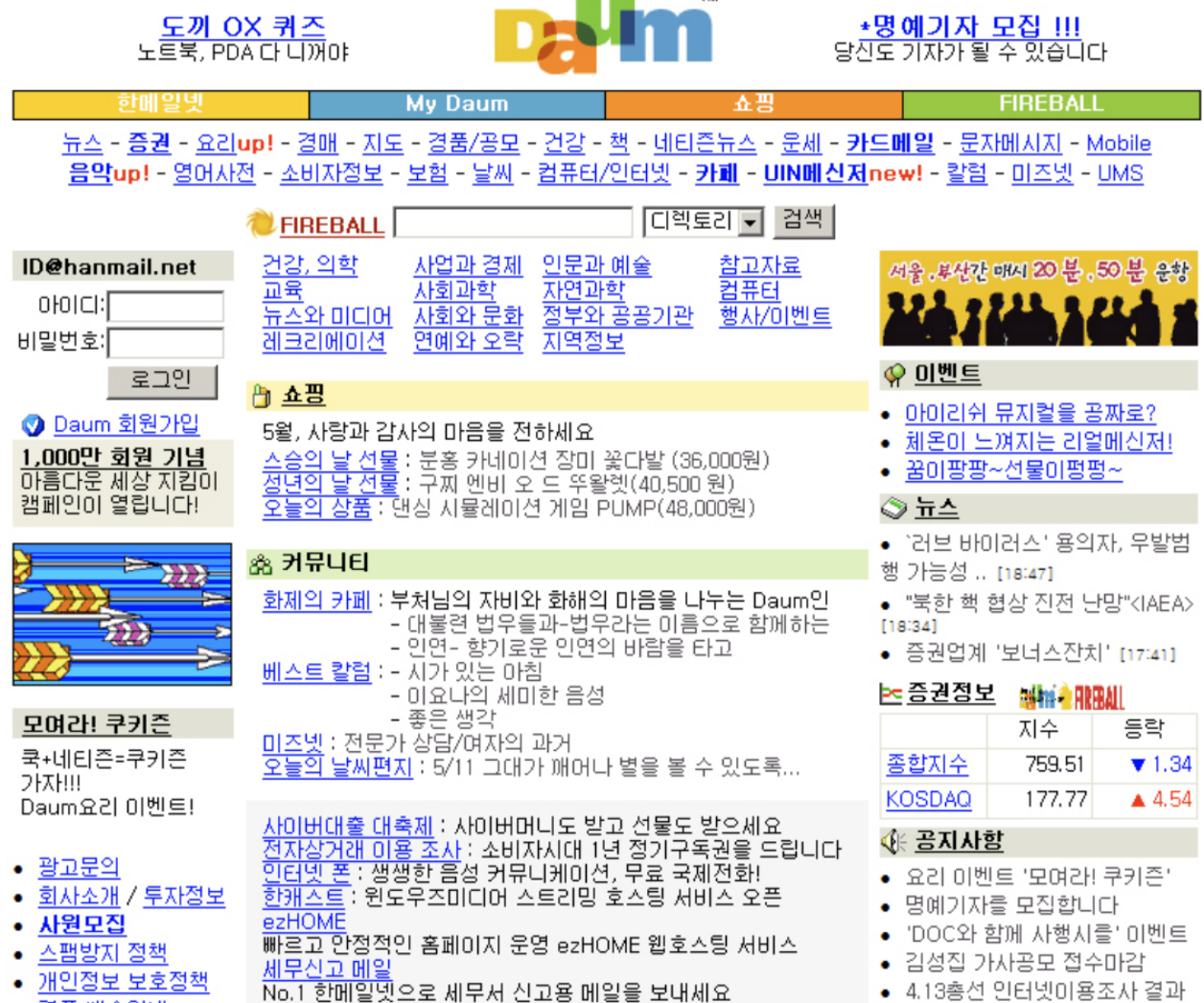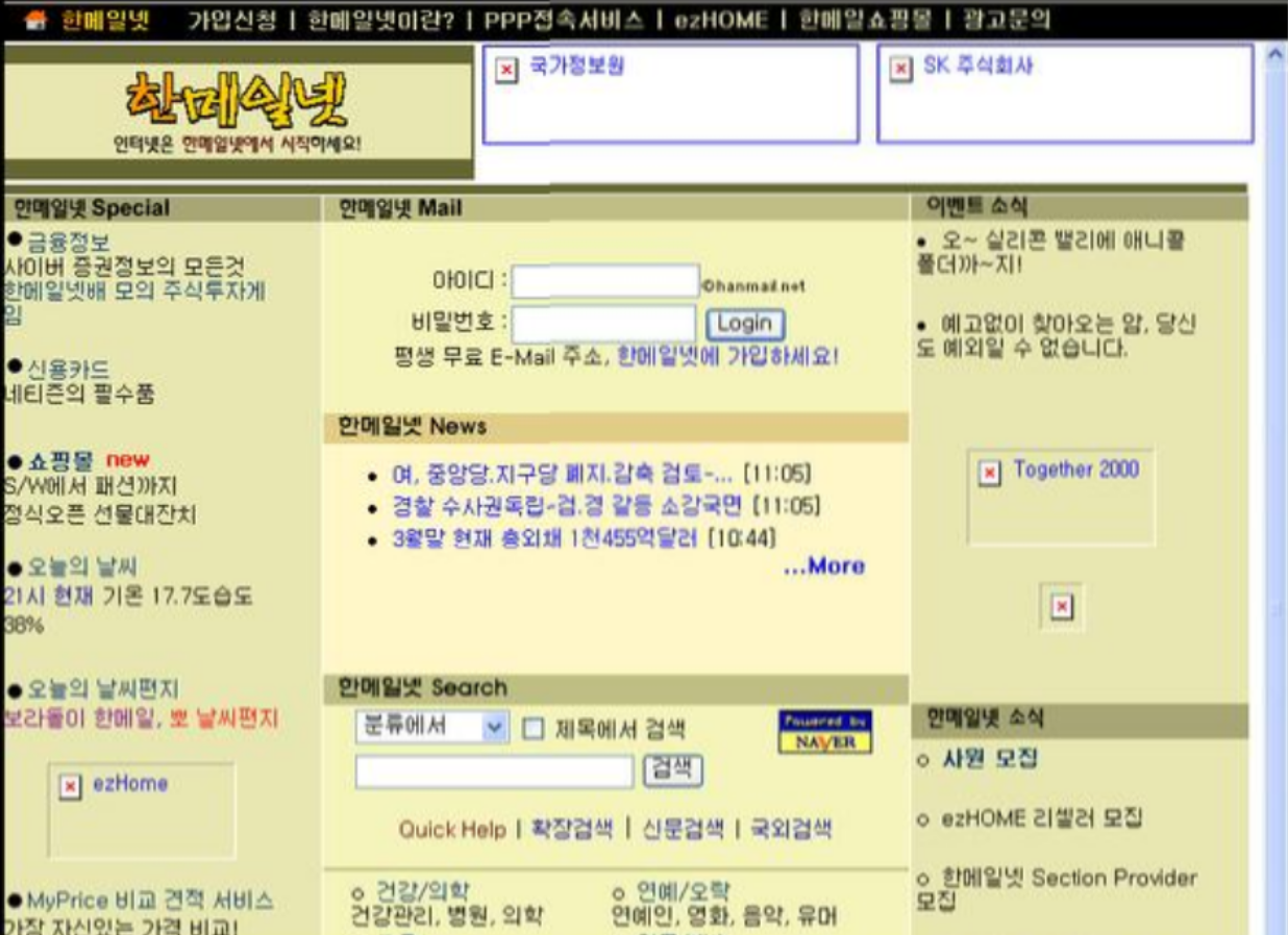 이 한메일넷은 단순한 메일 서비스에 그치지 않았습니다. 곧이어 포털 다음(Daum)으로 발전하는 기반이 되죠. 1998년경부터는 한메일넷 내부에 검색 기능이 추가되었는데, 이 당시에는 자체 기술력이 부족해 네이버의 검색엔진을 빌려 쓰고 있었습니다. ‘powered by NAVER’라는 문구가 화면 한켠에 자리하고 있었죠. 이처럼 검색까지 포괄한 포털로 성장하려는 움직임은 있었지만, 본격적으로 독립적인 검색 서비스를 제공하게 된 것은 2000년 이후의 일입니다.