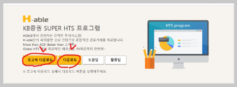 링크로 들어가면 위와 같은 화면을 볼 수 있습니다. 여기에서 '초고속다운로드'와 '다운로드'가 있습니다. 둘 중에 하나를 선택을하면 KB증권 HTS 다운로드가 가능합니다. 초고속 다운로드라고 해서 더 빠르지는 않은것 같아요. 먼저 손길이 닿는것을 선택을 하시면 됩니다.