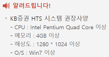 시스템 권장사항은 위와 같습니다. 최근에 맞춘 컴퓨터라면 아무런 문제 없이 가동이 되리라 생각하네요. 그냥 신경쓸 필요가 없는 수준의 HTS 권장사양입니다.